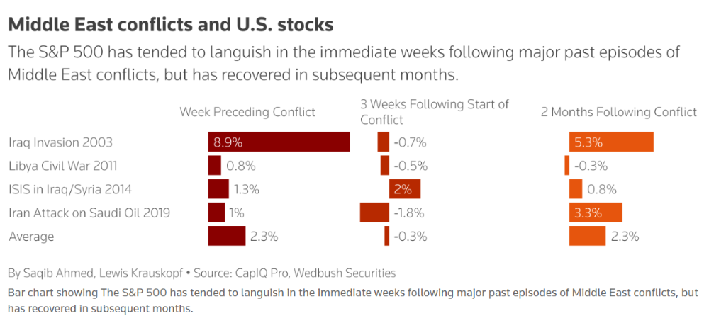 据Wedbush Securities和CapIQ Pro数据,历史经验显示,在过去中东紧张局势升级的重要时刻,包括2003年伊拉克入侵和2019年沙特石油设施遭袭,股市最初表现疲软但随后反弹。平均而言,标普500指数在冲突开始后三周内下跌0.3%,但在冲突爆发两个月后平均上涨2.3%。