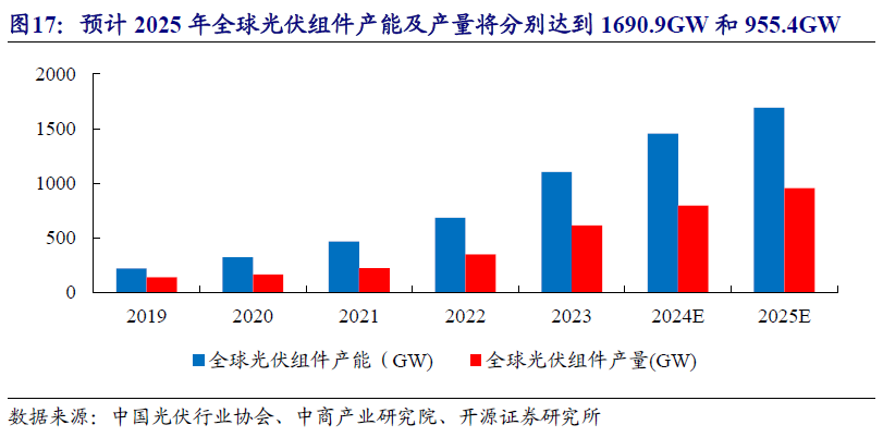 国内同样保持高速增长,根据国家能源局数据,2023年国内光伏发电新增装机216.88GW,同比增长148.12%。根据中国光伏行业协会预测,2024年全球光伏新增装机约为390-430GW,中国光伏新增装机达277.17 GW,同比增长约28%。根据国际可再生能源机构(IRENA)在《全球能源转型展望》中提出的1.5℃情景,到2030年,可再生能源装机需要达到11000GW以上,其中太阳能光伏发电和风力发电约占新增可再生能源发电能力的90%。