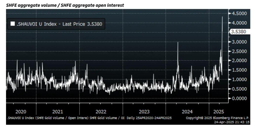 4月22日,当黄金价格涨至3500美元/盎司时,3家中国经纪商合计交易了约21.2万份芝加哥商品交易所(CMX)当量合约(相比之下,今年迄今CMX的平均交易量约为24万份合约),且持仓量没有显著变化。