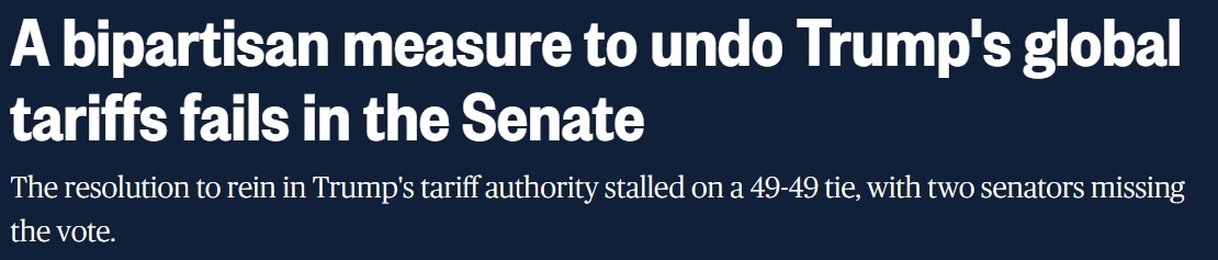 这项“叫停”总统关税政策的表决,票数一度为49票赞成、49票反对,不仅民主党人集体支持,且有3名共和党人投出了赞成票。取消关税的表决原本极有可能通过,但因2名议员缺席而导致投票失败。