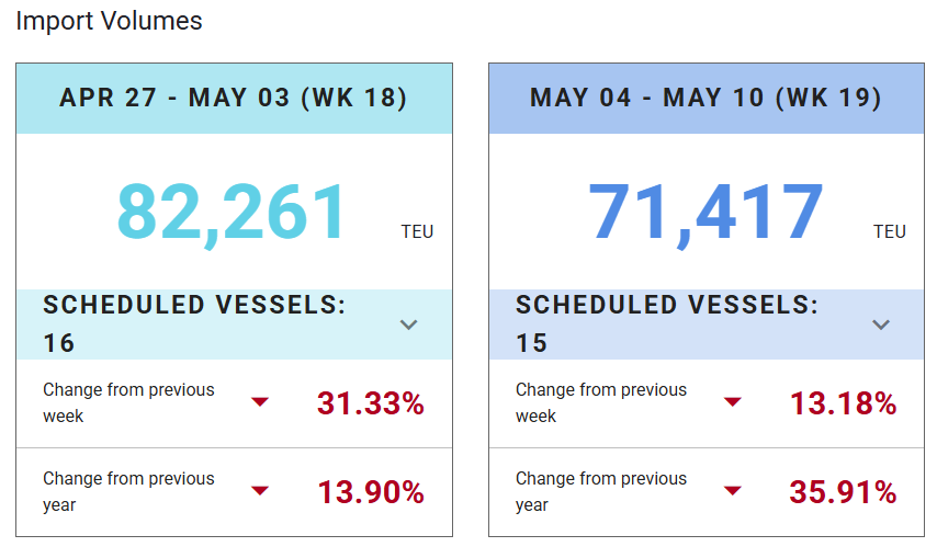 美国最大集装箱接收港——洛杉矶港的数据显示,预计5月4日至10日的一周,到港集装箱数量同比下降35.91%。
