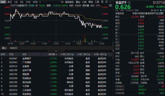 成份股方面,白酒、大众品均表现不振。截至收盘,盐津铺子、广州酒家、金徽酒跌超2%,金种子酒、酒鬼酒、今世缘等多股跌超1%,拖累板块走势。