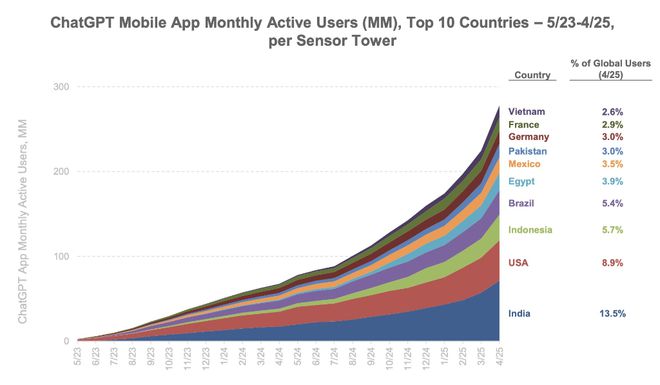 报告数据显示,印度已经成为ChatGPT最大的月活用户来源,使用量甚至超过美国本土。