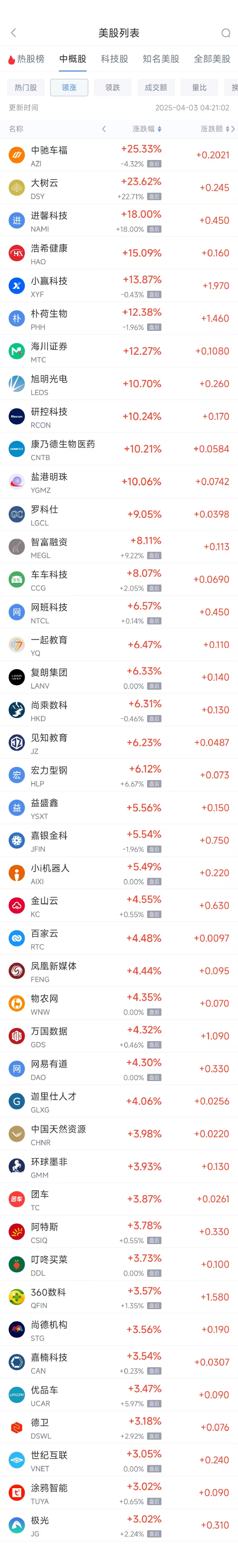 领涨中概股列表: